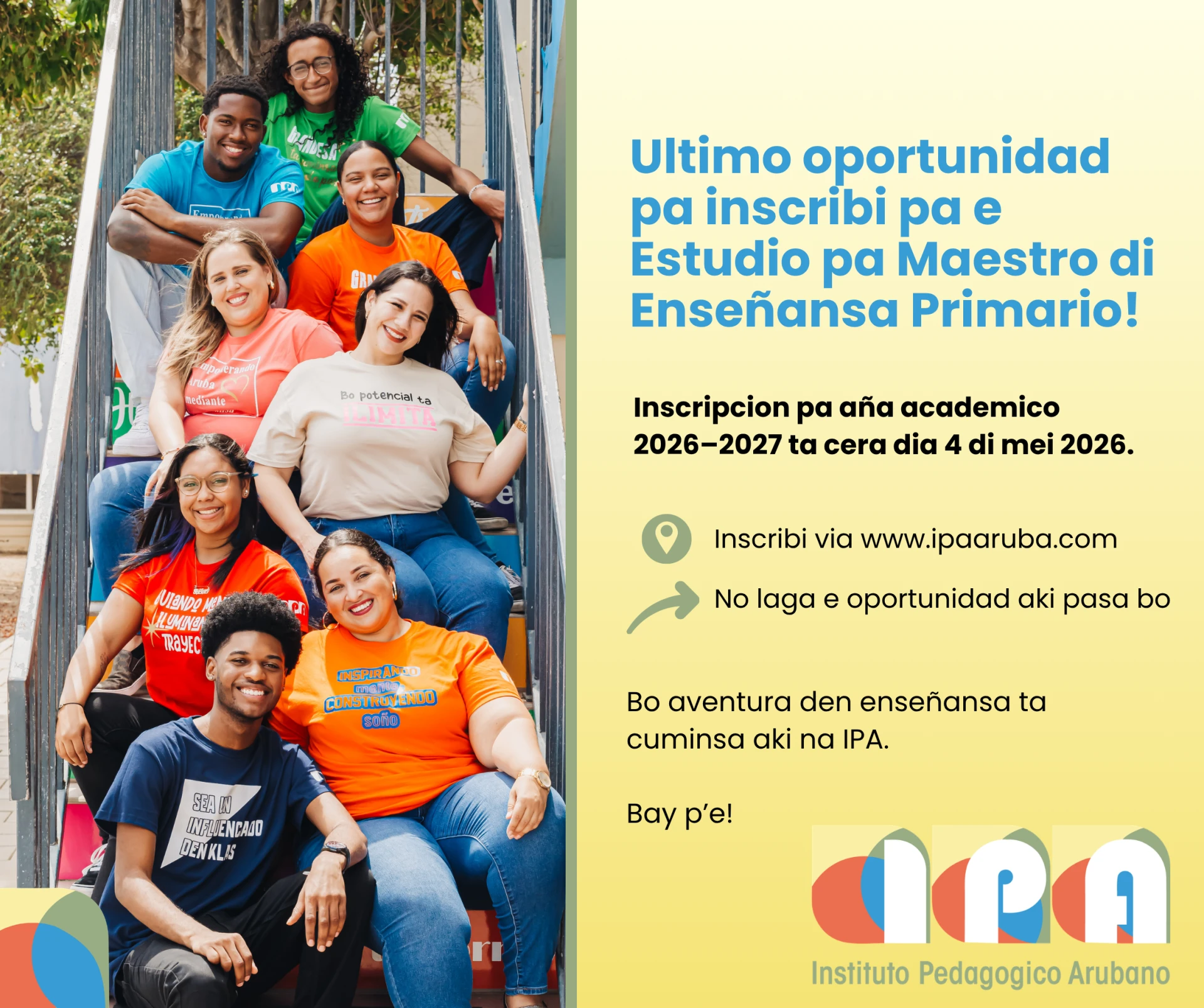 Read MoreInstituto Pedagogico Arubano (IPA) ta recorda e studiantenan cu tin diploma di havo, vwo of mbo nivel 4 (of studiante cu ta den ultimo aña di esakinan) cu inscripcion pa e Estudio pa Maestro di Enseñansa Primario pa aña academico 2026 – 2027 ta cera dia 4 di mei 2026.
