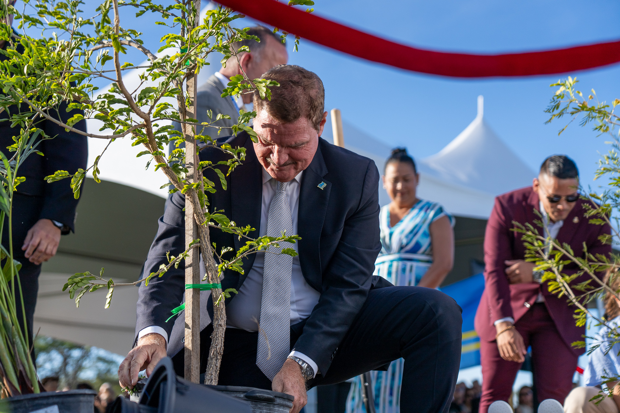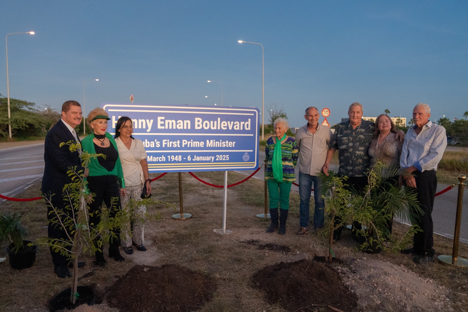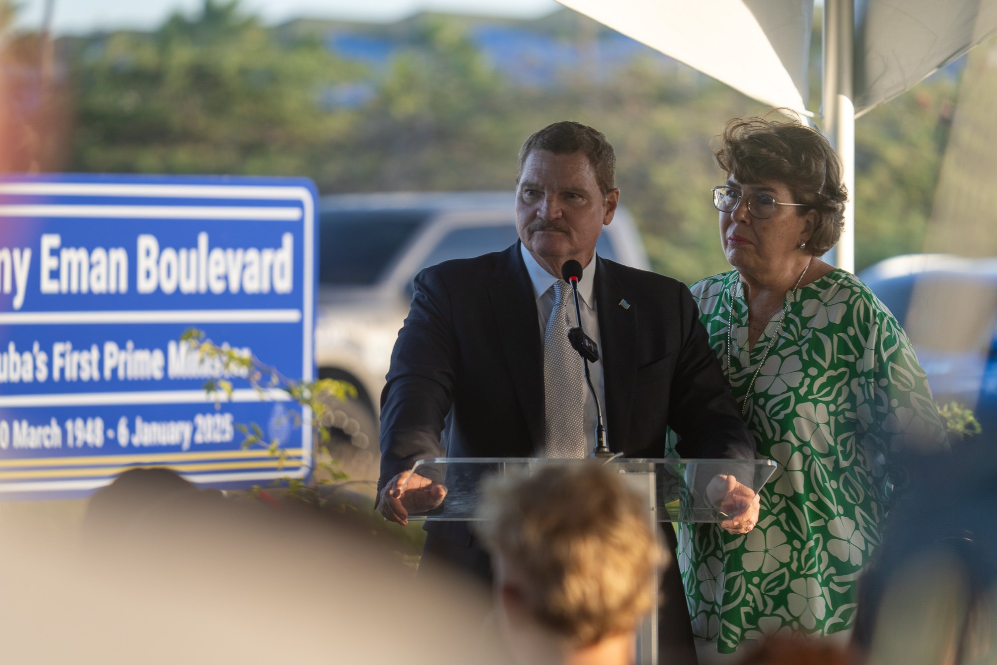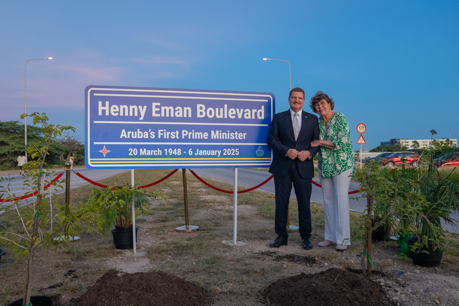 Cu lagrima na wowo, emocion halto y un sentido inmenso di orguyo y gratitud, Prome Minister di pais Aruba mr. Mike Eman a duna su discurso durante un ceremonia cu pa hopi tabata grandemente na su luga, pa rindi homenahe na un visionario indiscutibel pero mas cu tur cos, na su ruman homber grandi cu a fungi como Aruba su Prome Minister-President.