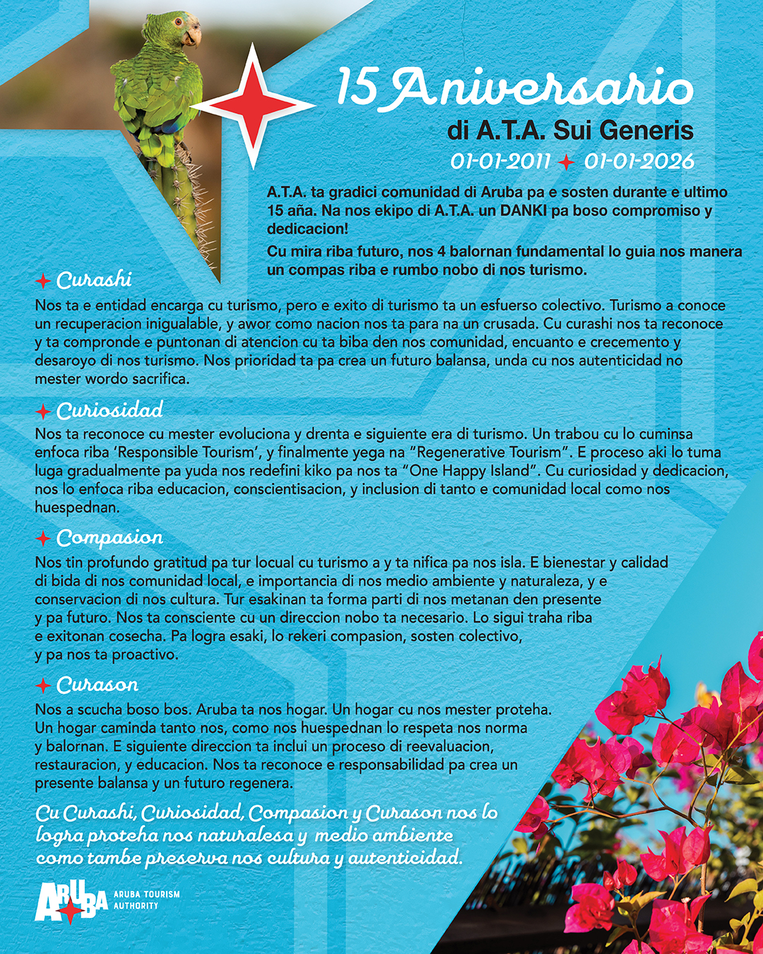 Aruba Tourism Authority (A.T.A.) ta celebra 15 aña como un entidad Sui Generis, un organisacion independiente, pero den un esfera publico. Originalmente conoci como Toeristenbureau, pa despues crea A.T.A. ‘Sui Generis’ dia 1 di januari 2011.