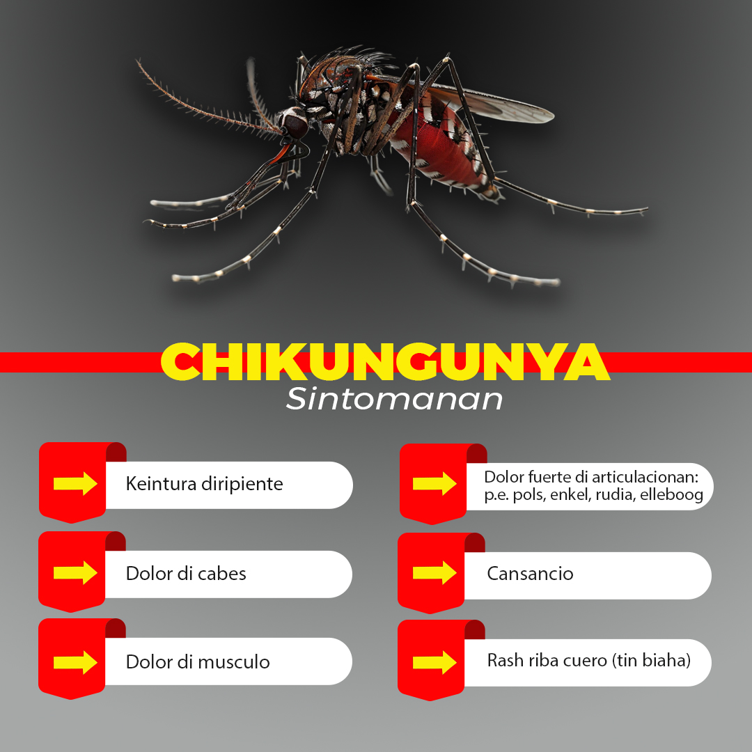 Chikungunya ta un malesa viral cu ta wordo transmiti pa e mesun sangura cu ta transmiti Dengue (sangura pata blanco). E sintomanan mas comun ta: