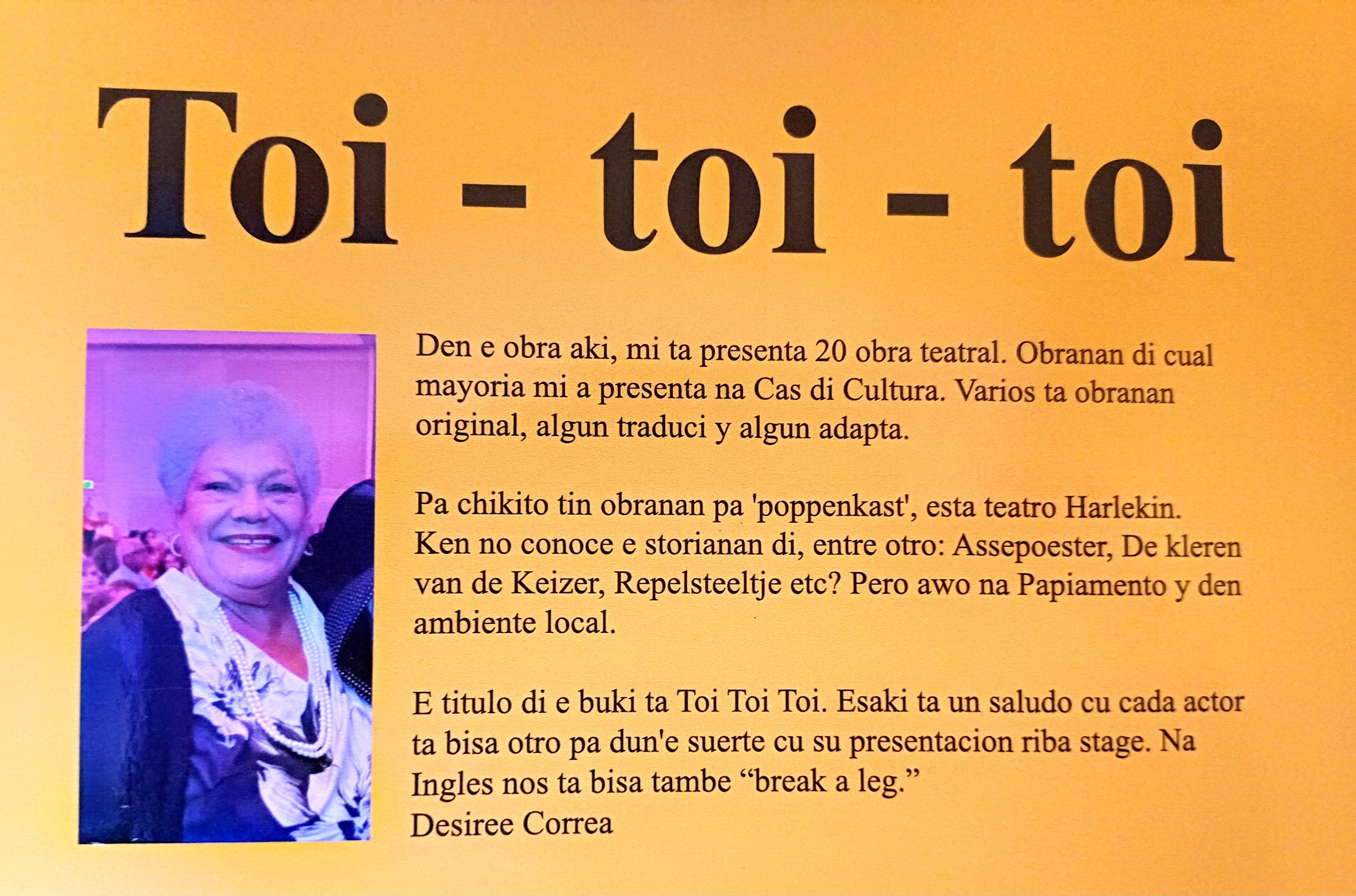 Siman pasa, autor Desiree Correa, a presenta su obra literario ‘Toi-toi-toi’ na Biblioteca Nacional Aruba. E buki ‘Toi-toi-toi’ ta contene diferente obra di teatro cortico na Papiamento. Obranan di Teatro skirbi pa Desiree y tambe obranan di teatro traduci y adapta pa Desiree Correa.