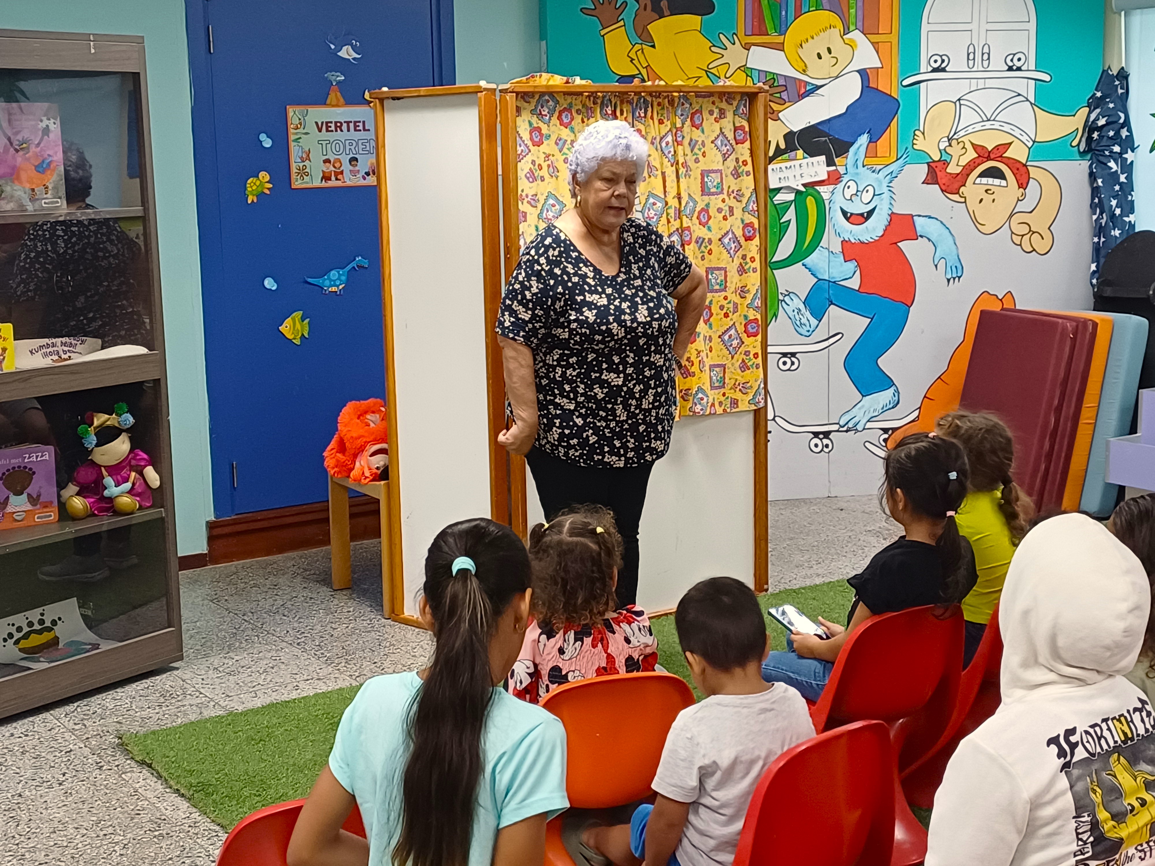 Dialuna atardi autora sra. Desiree Correa a duna un presentacion di Poppenkast na biblioteca pa un grupo di mucha y nan mayor. Un presentacion hopi anima y alegre cu interaccion entusiasma di e publico presente.