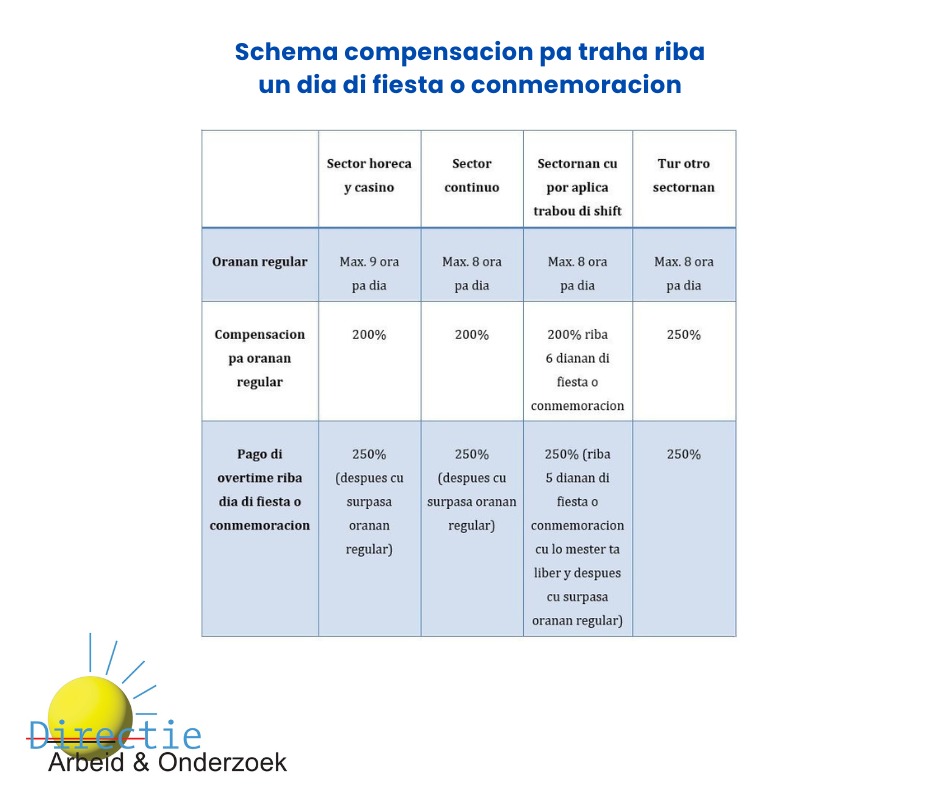 Pa sectornan horeca, casino y continuo (companianan cu ta traha 24/7- conoci como ‘traha warda’) un dia di fiesta o conmemoracion por ta un dia normal di trabou. Den caso cu e trahado ta riba schedule pa traha riba e dia aki e tin derecho riba 200% di su salario. Si riba e dia aki e trahado traha mas cu su oranan regular (pa sector horeca/casino esaki ta 9 ora y pa sector continuo ta 8 ora) ley ta considera cu e trahado ta traha overtime riba un dia di fiesta o conmemoracion y e tin derecho riba 250% pa e oranan extra.
