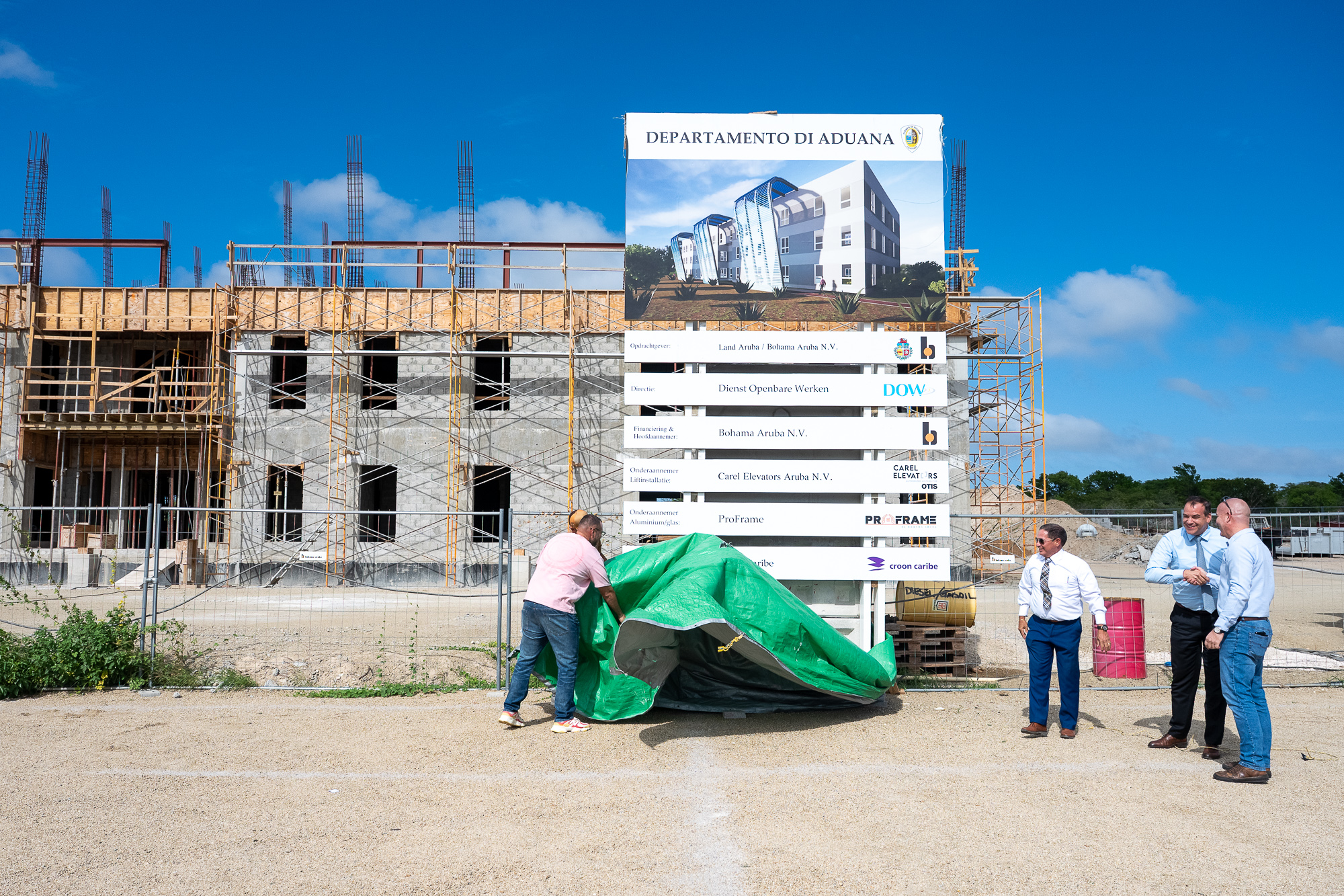 Awe diamars a tuma luga e desvelacion di e borchi di construccion di e edificio nobo pa Departamento di Aduana Aruba. E acto aki ta marca un logro importante den e proceso di modernisacion y fortalecemento institusional di Aduana, y ta confirma e compromiso continuo cu profesionalismo y mehor servicio na beneficio di e economia di Aruba.