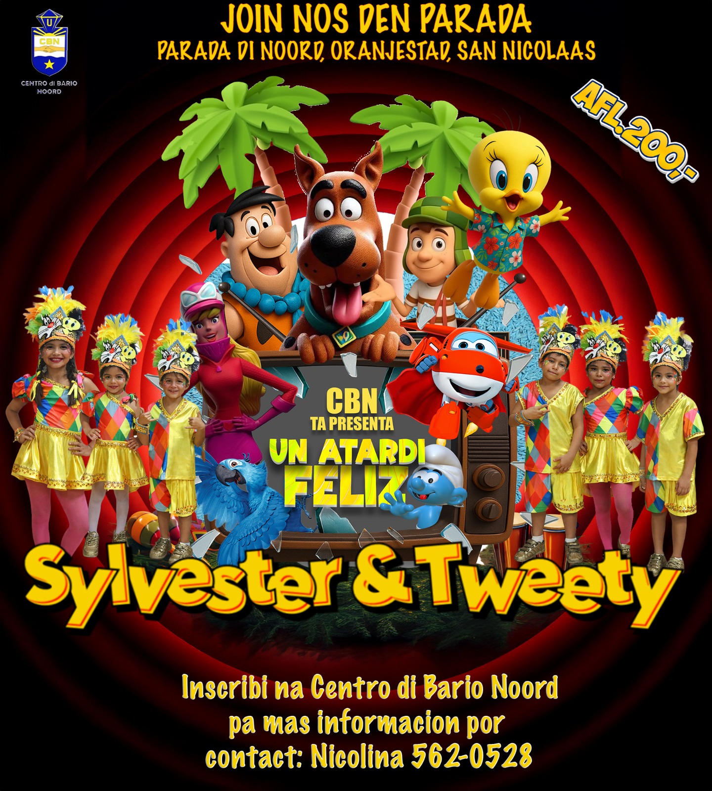 Nos tema di grupo di Carnaval ta “Un Atardi Feliz” y lo concentra e.o. riba comequitas. E tema di nos massa ta “Tweety y Sylvester”. Nos ta participando den tur 3 Parada di Mucha y participacion den massa ta Afl. 200,- pa cada mucha. Nos cede na Centro di Bario Noord ta habri di dialuna pa diabierna di 6or pa 9or di anochi. Pa mas informacion por tuma contacto cu Nicolina na 5620528.