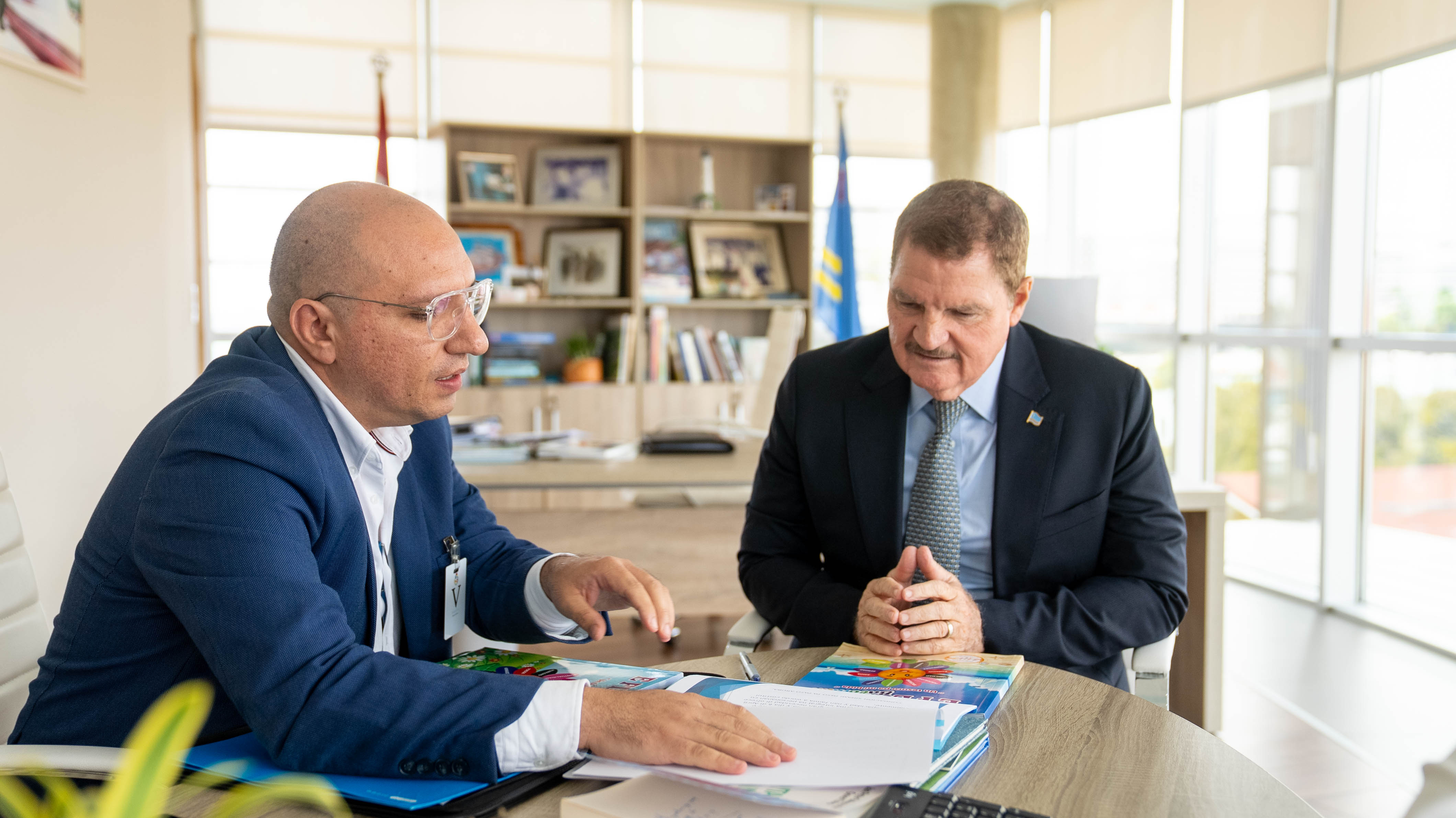 Awe mainta na Bestuurskantoor, Prome Minister Mike Eman a ricibi señor Carlos Falla, representante di Fundacion Siñami Paso pa Paso Aruba, den un bishita formal caminda a presenta un proyecto educativo enfoca riba formacion di balornan y desaroyo integral di mucha y hoben.