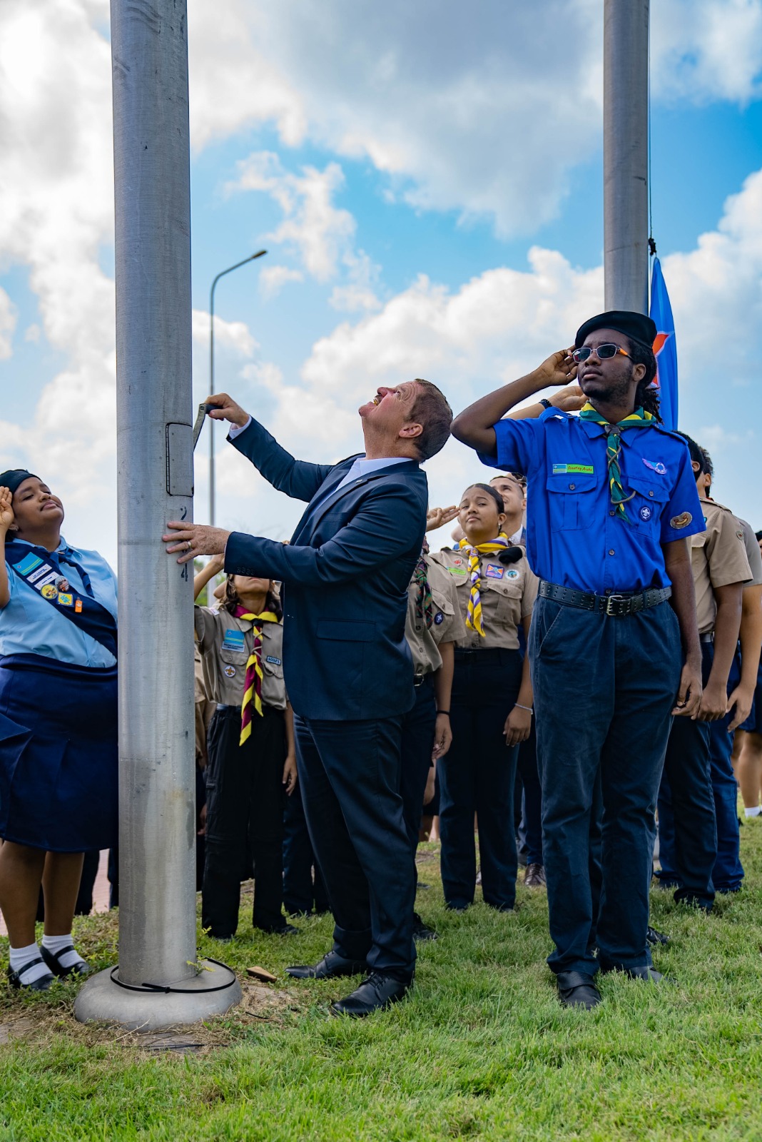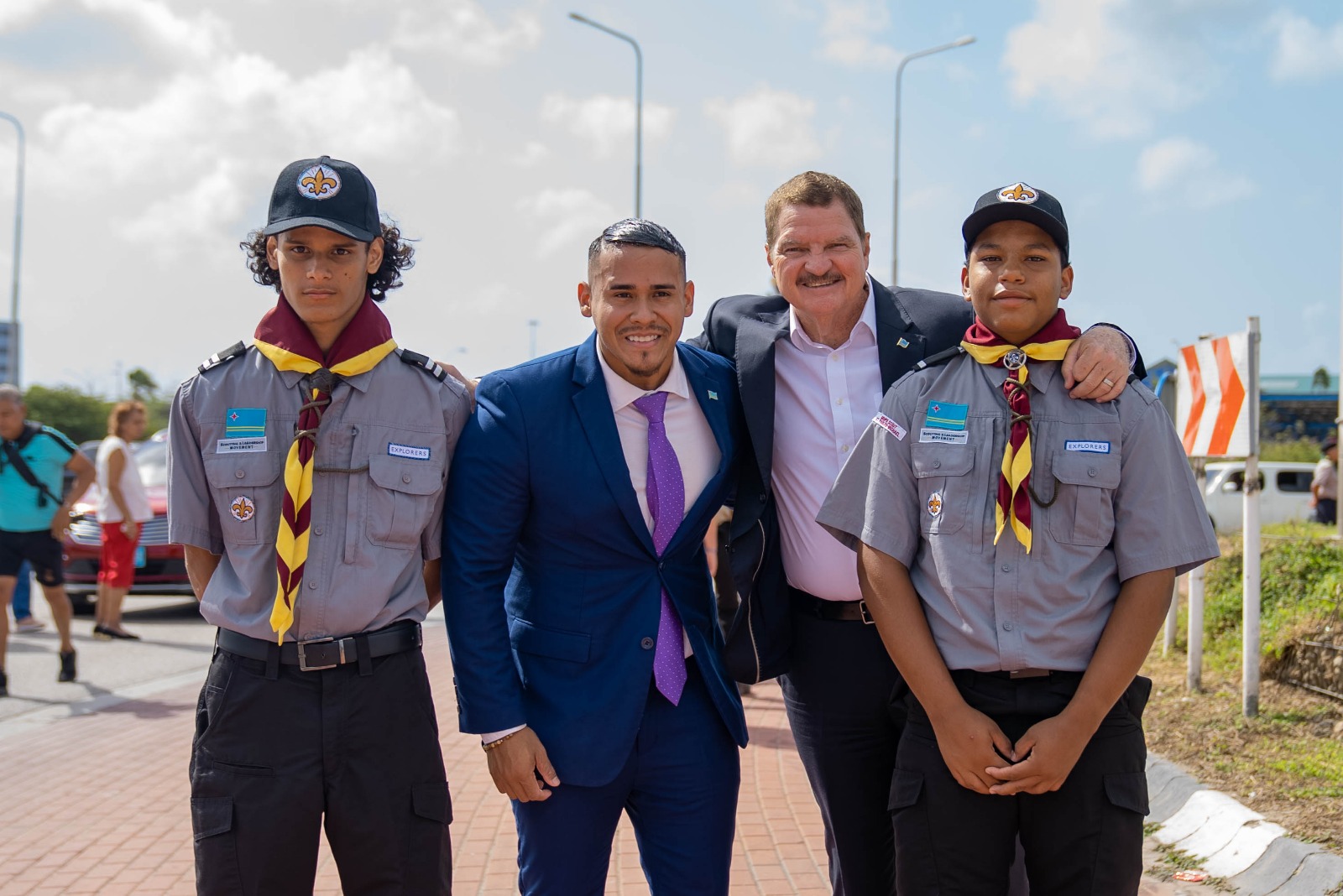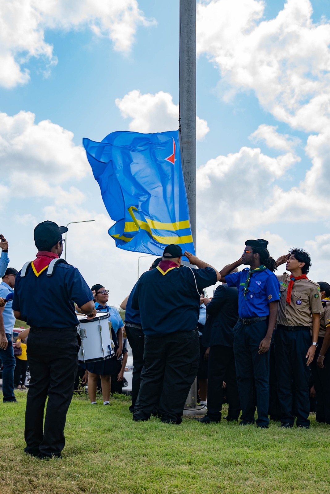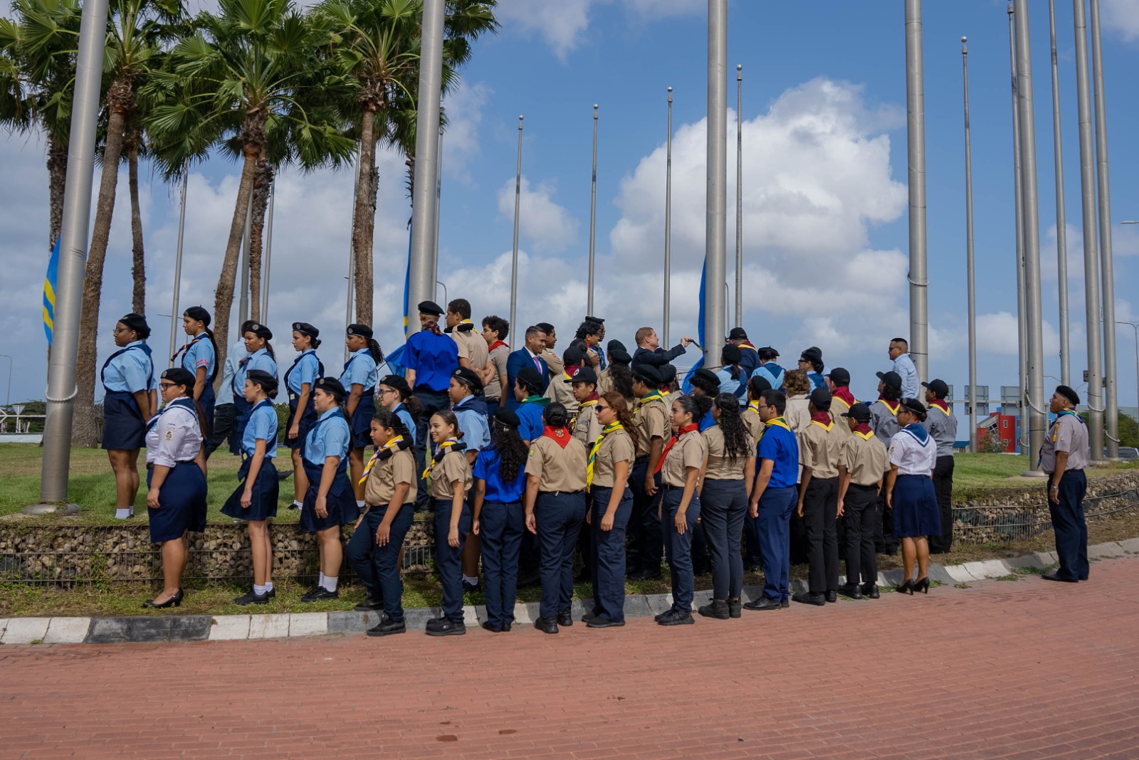 Den e marco aki, Prome Minister di Aruba mr. Mike Eman, acompaña pa e Minister mas hoben di Gabinete AVP-Futuro Wendrick Cicilia, como tambe 40 hoben/mucha, a hisa en total 35 bandera, simbolisando orguyo nacional, continuidad den generacion y e compromiso cu futuro di Aruba.