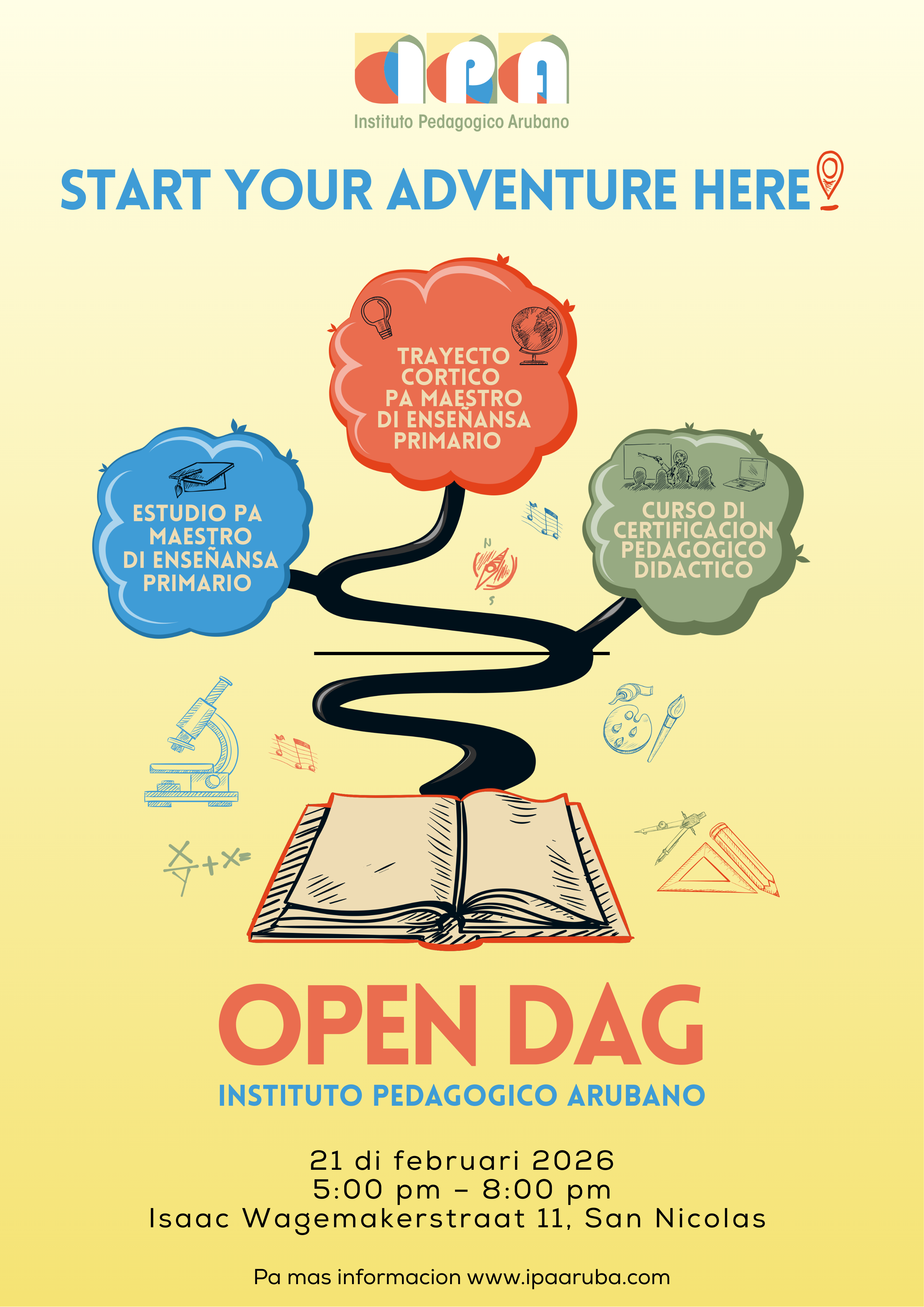 “Start your adventure here!”, esaki ta e tema di Instituto Pedagogico Arubano (IPA) su open dag 2026 cu lo tuma luga diasabra 21 di februari di 5:00 pm – 8:00 pm na IPA (Isaac Wagemakerstraat 11, San Nicolas). Riba e dia aki IPA ta habri su portanan pa tur persona cu kier descubri mas di e rol crucial y e influencia grandi di maestro den enseñansa. Nos kier pa abo, cu tin e pasion pa bira maestro, bin combersa cu nos y si bo ta explora opcion di estudio, join nos y laga nos inspira bo.