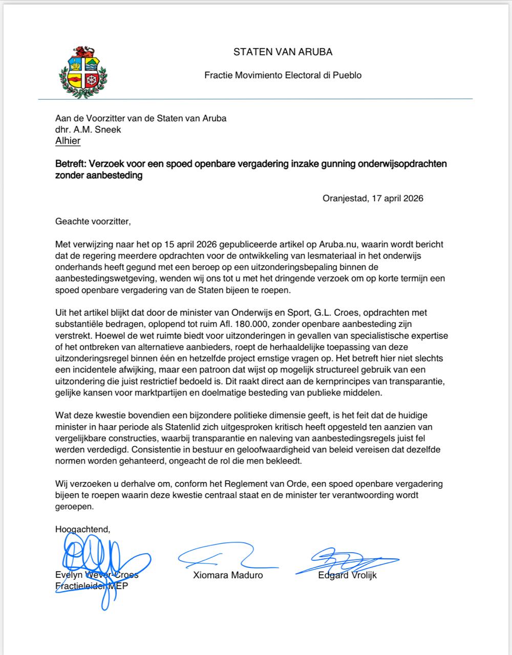 Fraccion di MEP a haci un peticion pa yama un reunion publico urgente di Parlamento pa discuti e decisionnan recien di e Ministerio di Enseñansa y Deporte, bou di Minister di Gerlien Croes, pa otorga varios proyecto pa desaroya material di enseñansa sin proceso di destaho publico.