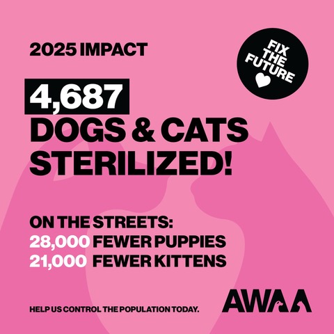 Animal Welfare Alliance Aruba (AWAA) a anuncia cu su programa di sterilisacion masal a prevení un estimacion di 49,000 cachó y pushi di nace den situacion di caya solamente den aña 2025. Esaki ta marca e aña mas impactante di e organisacion te awor.