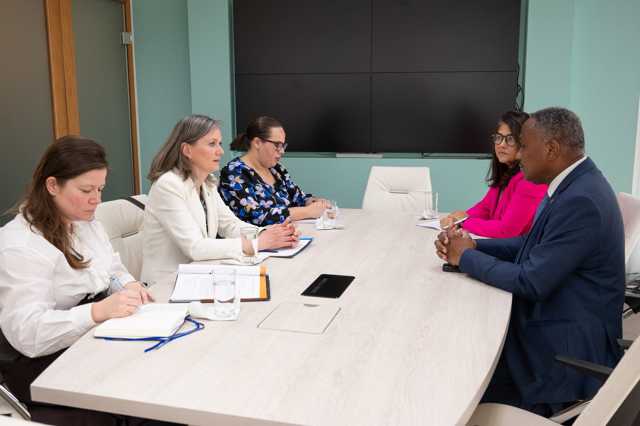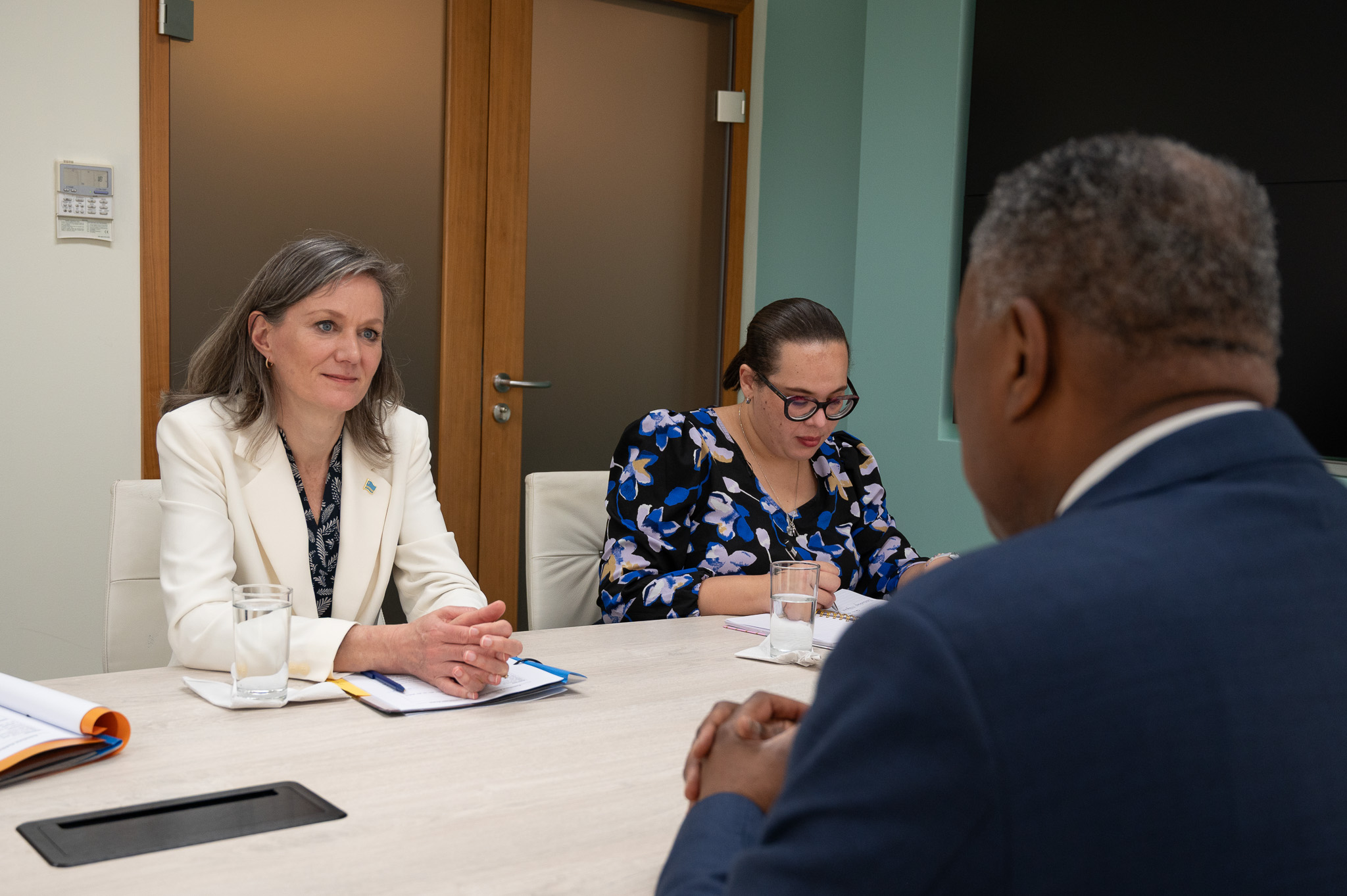 Sra. Lise Gregoire-van Haaren, Representante Permanente (apunta) di Reino Hulandes na Nacionnan Uni na New York, a haci un bishita di introduccion na Minister di Husticia, Integracion, Transporte Publico y Energia, mr. drs. Arthur Dowers.