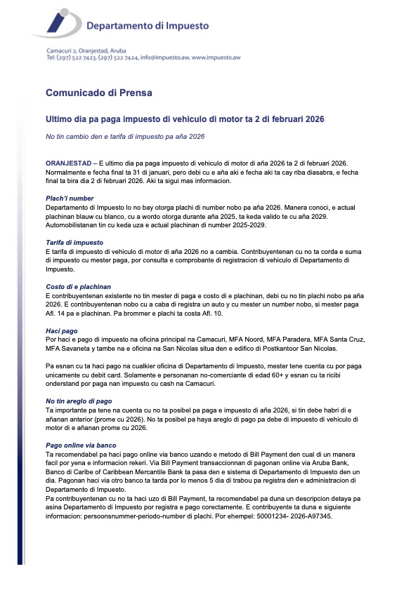 Ultimo dia pa paga impuesto di vehiculo di motor ta 2 di februari 2026